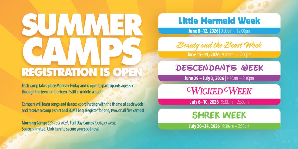 2026 SUMMER THEATRE CAMPS – Ages 6-13 (14 if still in middle school): Week 1 or 2 is $330/Week for Monday-Friday 9:00-12:00pm (aftercare available for an additional $25 fee for those going from Summer Camp to Madagascar rehearsal); Week 3, 4 or 5 is $550/Week for Monday-Friday 9:30am-2:30pm